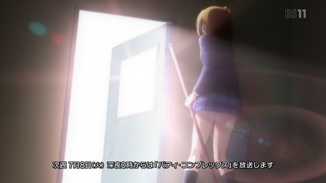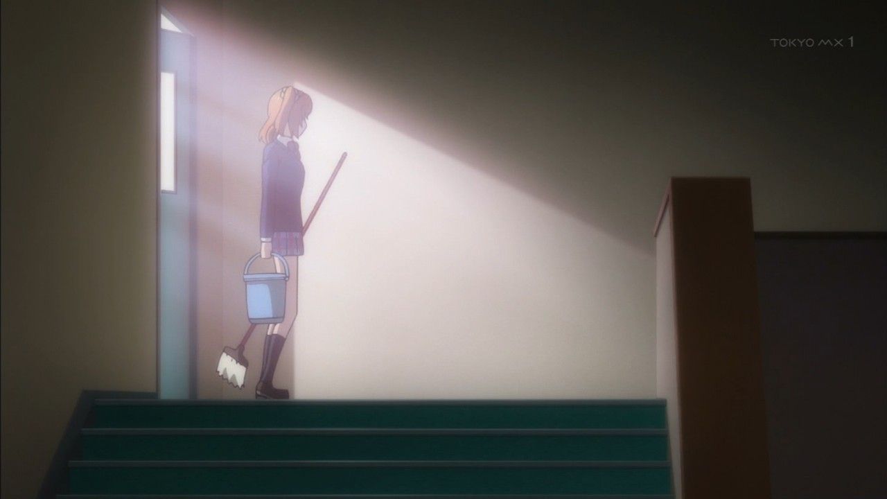 1期1話目冒頭の逆を行く感じでのシーン。あっちは階段駆け下りてだったけどこっちは登ってるからね。