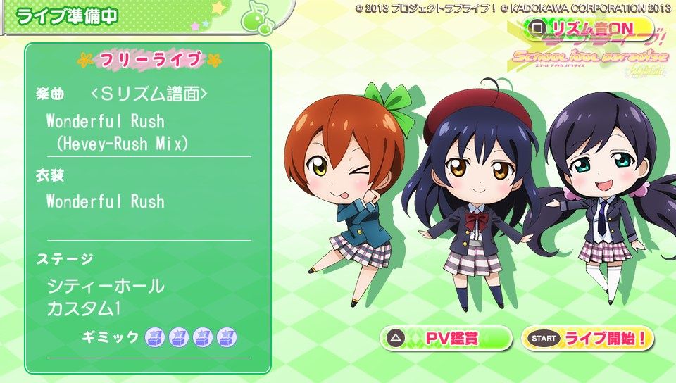 曲数ももうちょっと欲しいかな...まぁDLCで増えるんだろうけど、スクフェスに慣れきってしまっていると曲を金出して買ってプレイするってことに抵抗を感じてしまう人もいるかもしれない。好きなら任意でって感じで大丈夫だと思います。