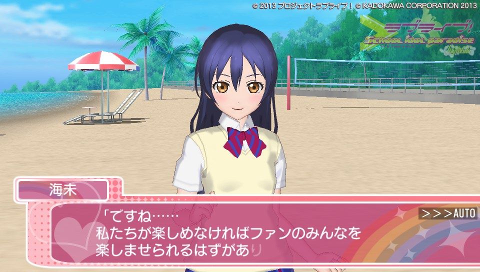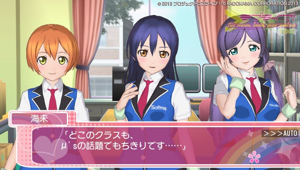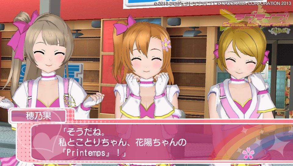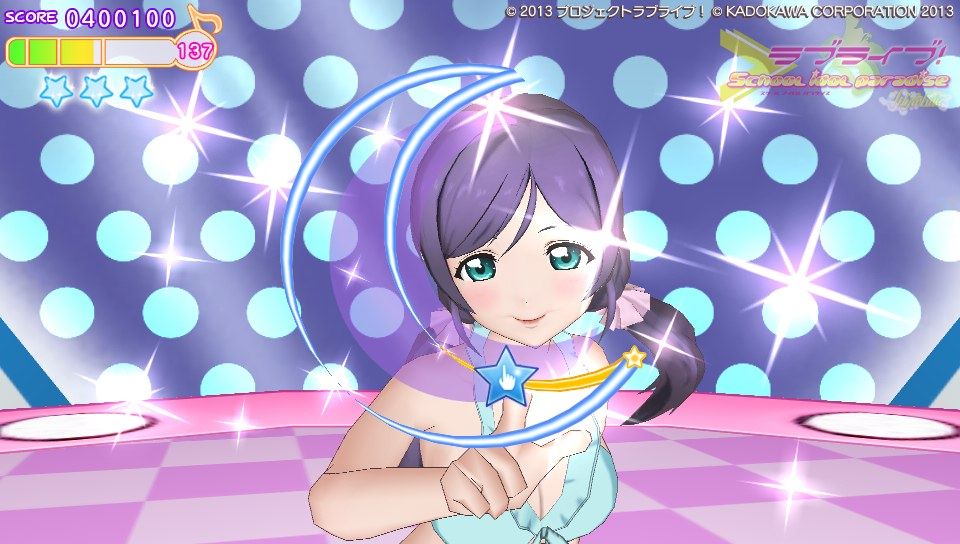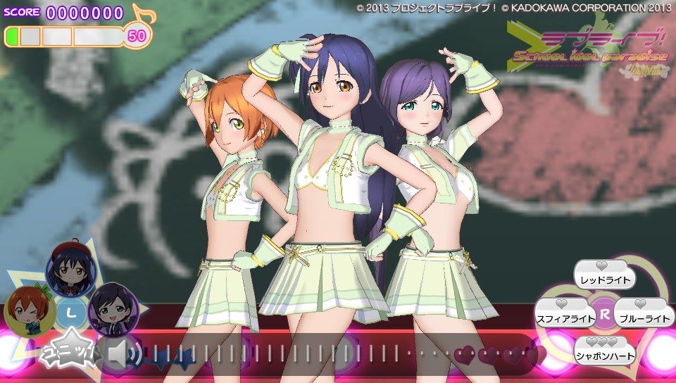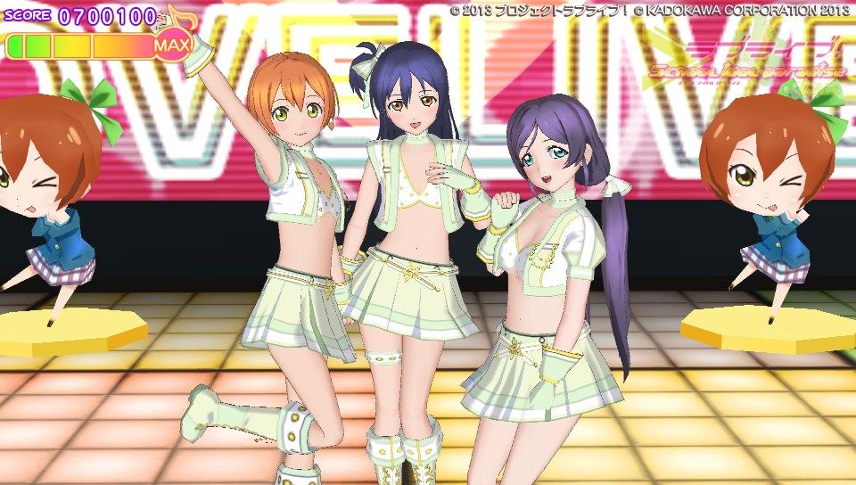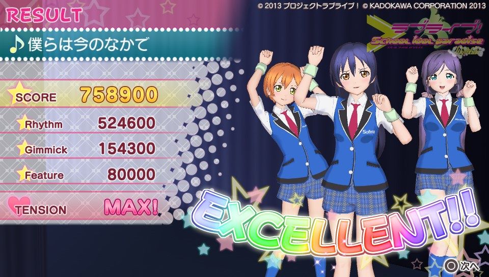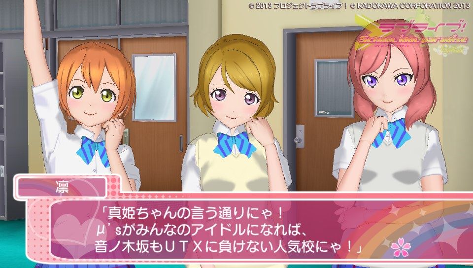 さて、ゲームの感想としては現時点でこんな感じです。さんざん言われてきたグラフィック、これをどう評価するかは人それぞかなぁ、でも高いクオリティって謳ってた割りにはそれはどうかなって、私は思います。でも割かし許容範囲かな?修正パッチもあてられたみたいだし。個人的には凛とにこのグラが良くて、ことりのグラがたまに変になるような?ストーリーのときことりの動作に若干のカクつきのようなものがあったから...人数が多いと処理が追いついていない感がありますが、ユニット曲やソロ曲の時は問題なく動作しています。多分目指してるクオリテ位は3人以下のときのものかな。