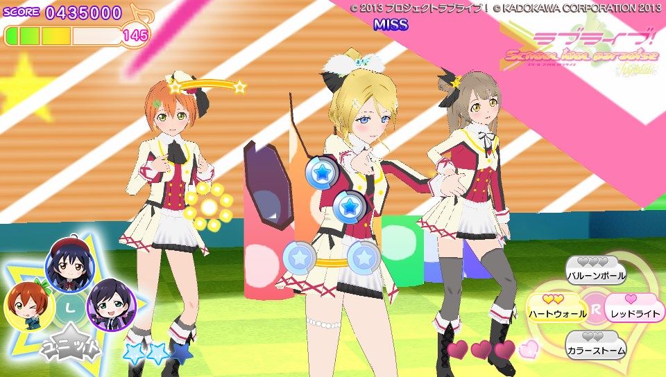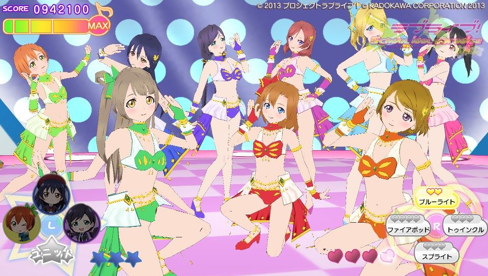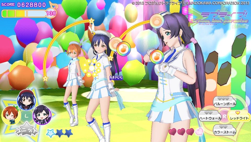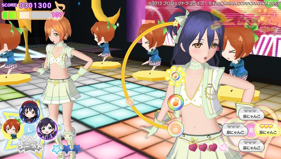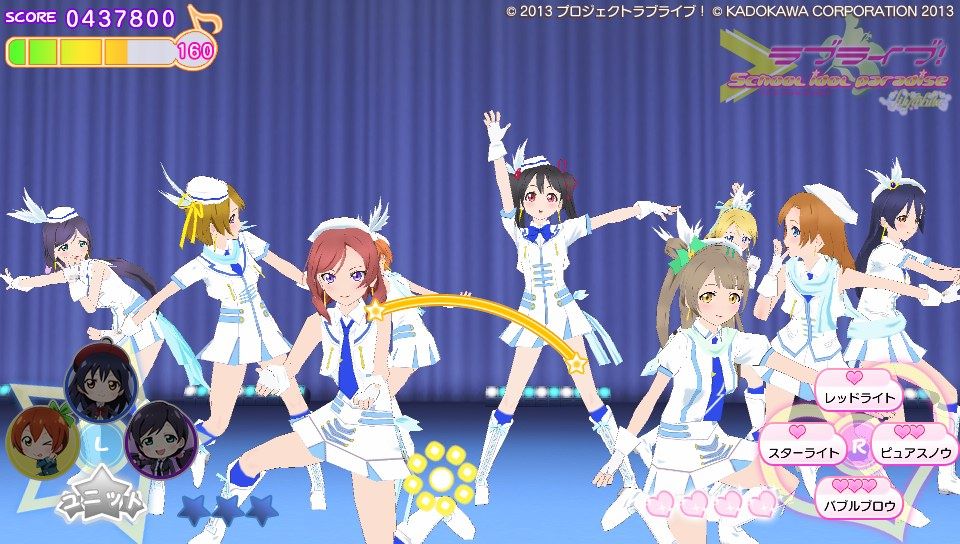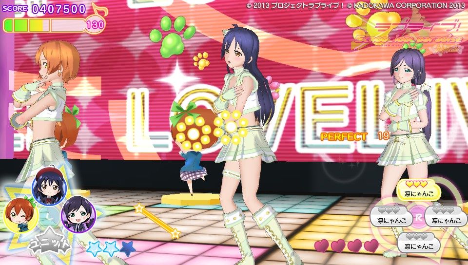 操作方法に関してはピンク色のハートノーツが○×△□ボタンと表タッチパネルの右半分、青色のスターノーツが十字キーと表タッチパネルの左半分。黄色の音符ノーツがハートノーツとスターノーツの同時押し。基本的な音ゲー要素としてはこのくらいです。難易度は通常と難しいの2種類しかないのでガッツリ音ゲーしたい人には物足りないかも。ノーツの種類も少ないし操作もスクフェスのように画面をタッチで行えるので、そこまで身構える必要は無いですね。ただ、大人数でのライブだとちょっとラグが出るかも?