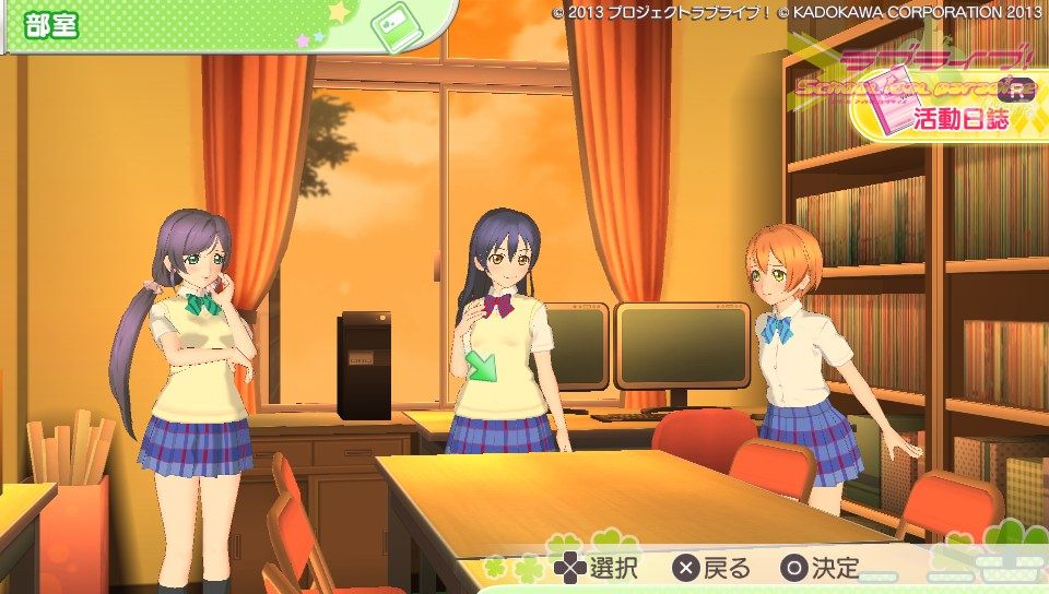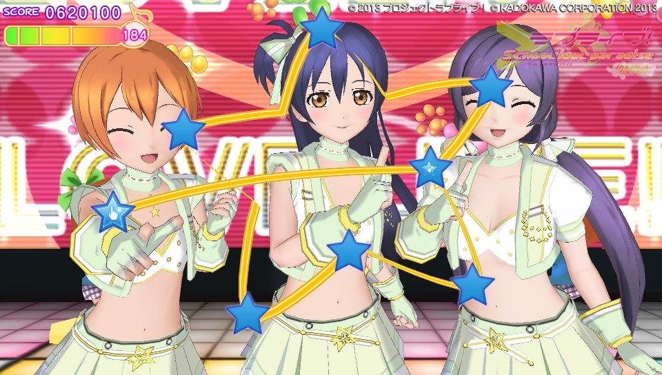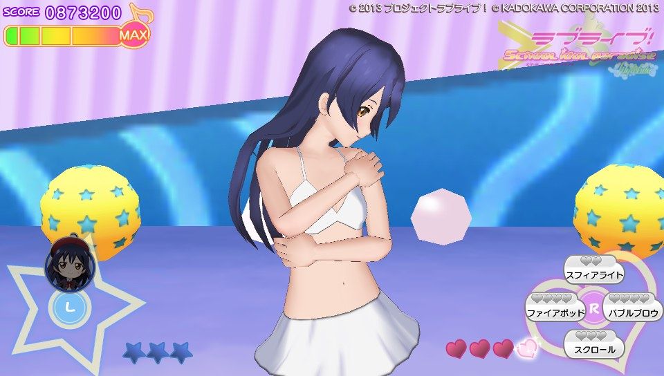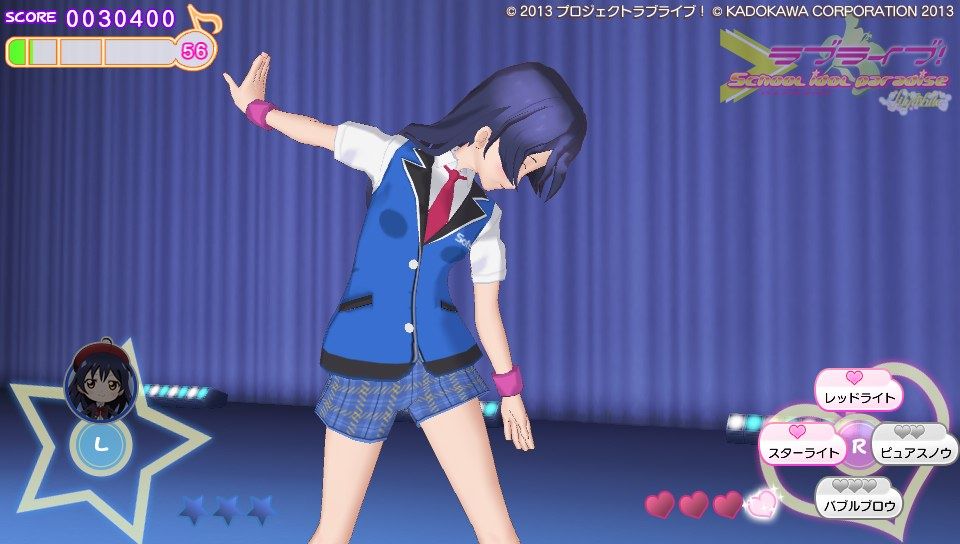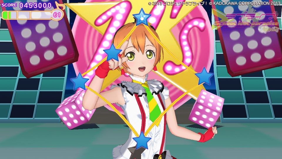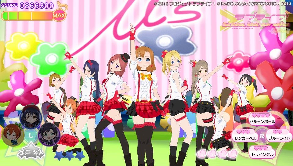 操作方法に関してはピンク色のハートノーツが○×△□ボタンと表タッチパネルの右半分、青色のスターノーツが十字キーと表タッチパネルの左半分。黄色の音符ノーツがハートノーツとスターノーツの同時押し。基本的な音ゲー要素としてはこのくらいです。難易度は通常と難しいの2種類しかないのでガッツリ音ゲーしたい人には物足りないかも。ノーツの種類も少ないし操作もスクフェスのように画面をタッチで行えるので、そこまで身構える必要は無いですね。ただ、大人数でのライブだとちょっとラグが出るかも?