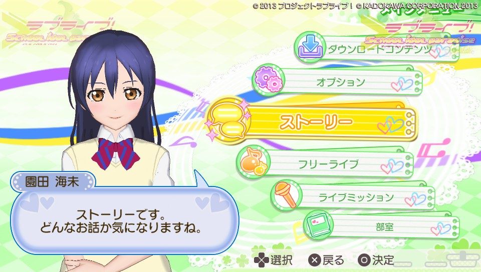 ここではスクパラオリジナルのストーリーを見ることが出来ます。合間合間にライブパート(音ゲー)があって、まぁスクフェスみたいな感じです。どうやらルート分岐があるみたいですね。私はまだ一つしかルートを終えてないです。