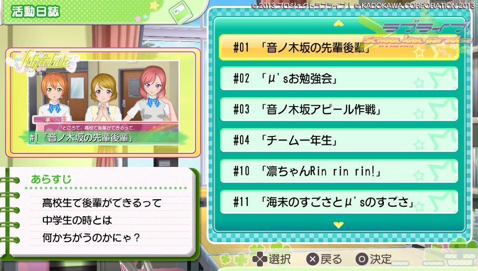 活動日誌を選択するとストーリーで見た話(サブストーリーのみ)が閲覧することが出来ます。私のは番号が4から10に飛んでますね。ここにルート分岐があるのかなぁ...