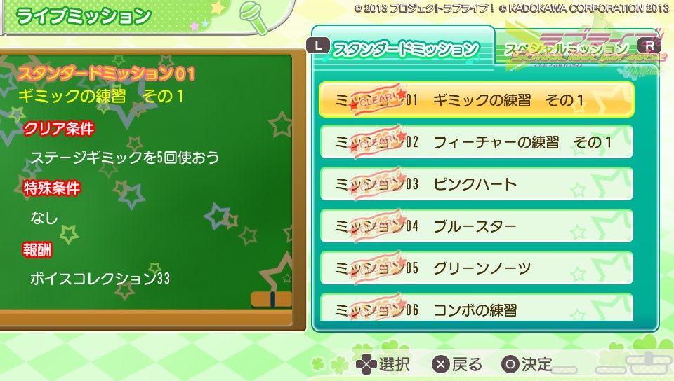 ここでは決められた目標を目指してライブを行います。たとえばスコア○○以上、ハートノーツのみ、特殊ノーツでのクリア等。ミッションクリアすればさまざまな報酬がもらえます。時間のある時にちまちまクリアする感じですかねぇ。