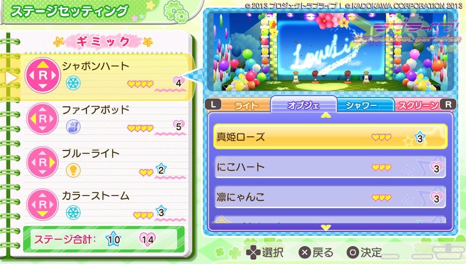 プレイ画面の右下にハートと4つの項目があります。これはライブ中にたまったハートを消費してステージギミックを発動させることが出来ます。タッチorR+右アナログキーで使いたいギミックを選択し発動させます。
